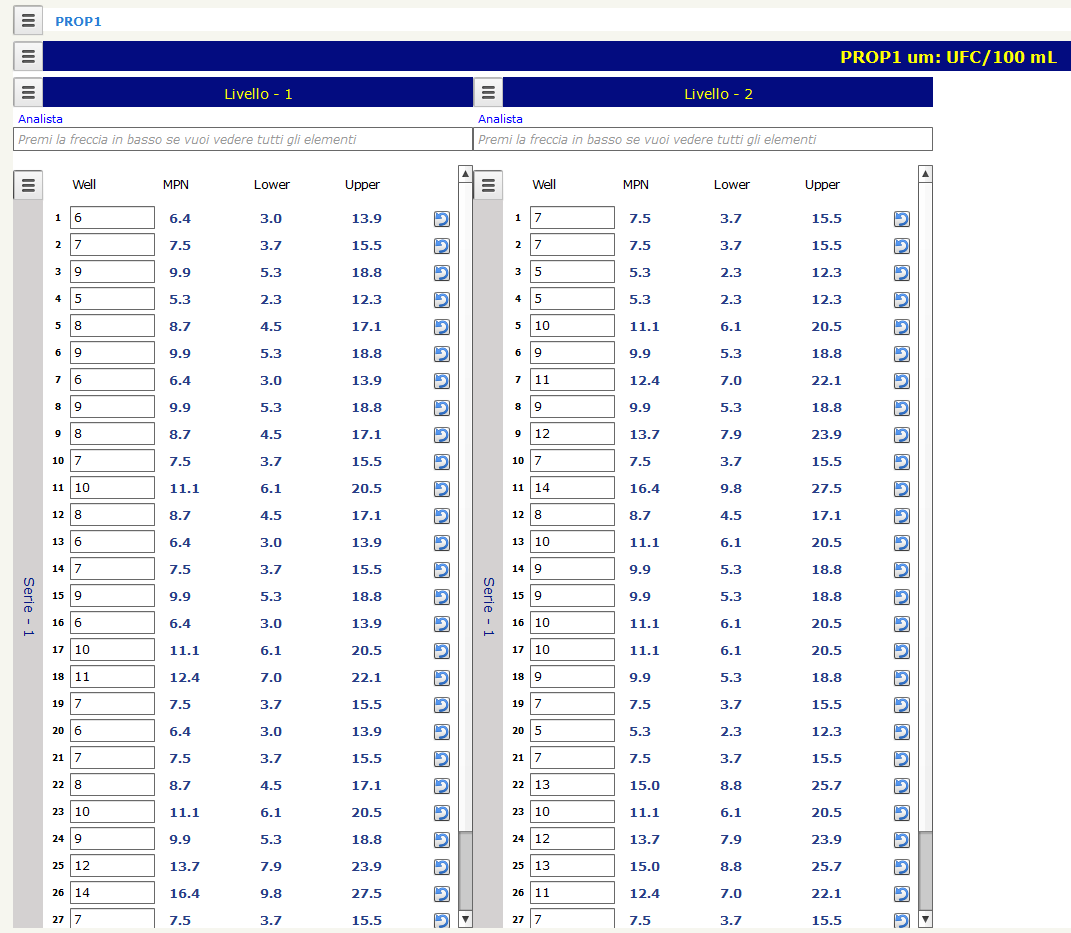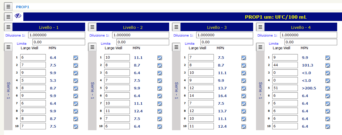 Il contributo di ripetibilità, definito per ogni proprietà, raccoglie tutte le misurazioni raggruppate per serie e livello. Come già anticipato, inserendo il numero di pozzetti positivi verrà ricalcolato l’MPN associato per ogni misurazione.